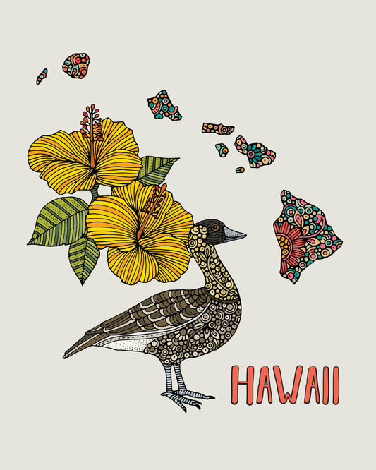 Hawaii State Map - State Bird nene/Hawaiian goose- State Flower yellow hibiscus