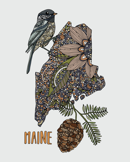 Maine State Map - State Bird Chickadee - State Flower White pine cone