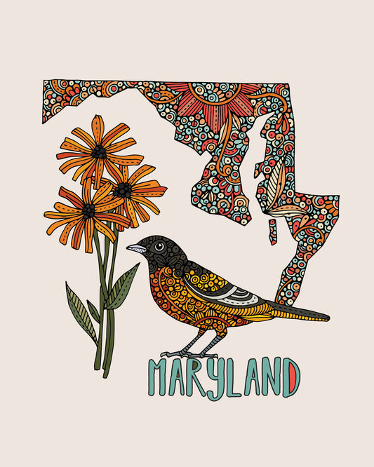 Maryland State Map - State Bird Western Baltimore Oriole- State Flower Black-Eyed Susan