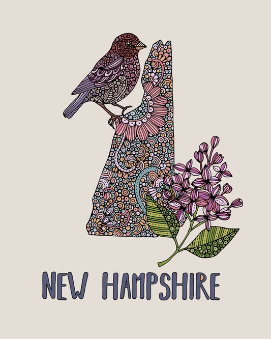 New Hampshire State Map - State Bird Purple finch- State Flower Purple lilac