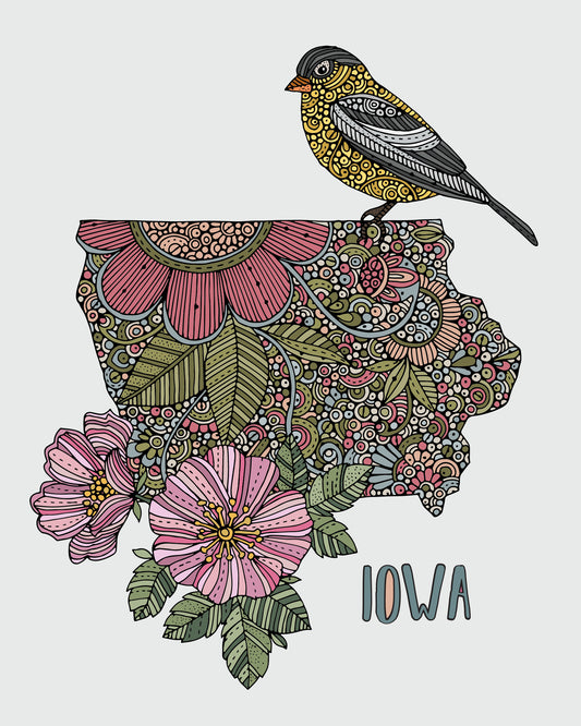 Iowa State Map - State Bird Eastern Goldfinch - State Flower Wild Prairie Rose