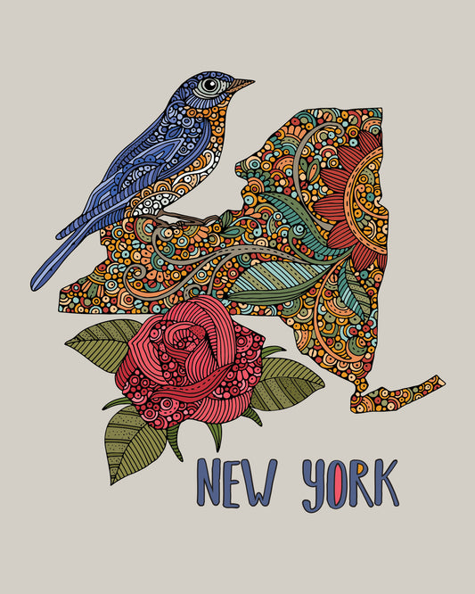 New York State Map - State Bird Bluebird - State Flower Rose
