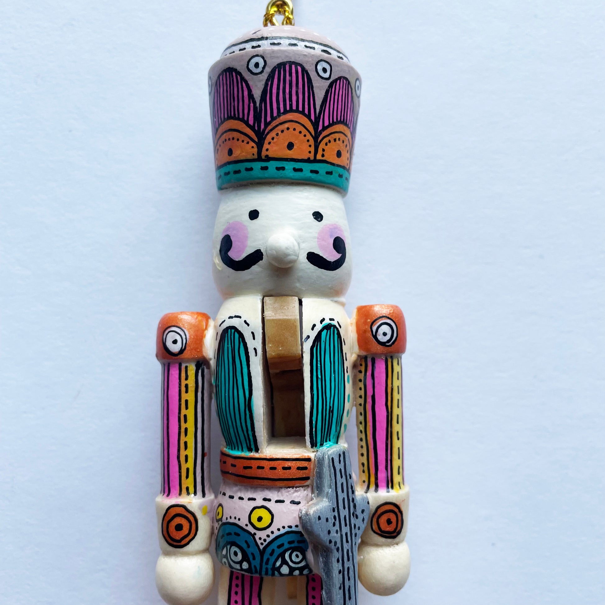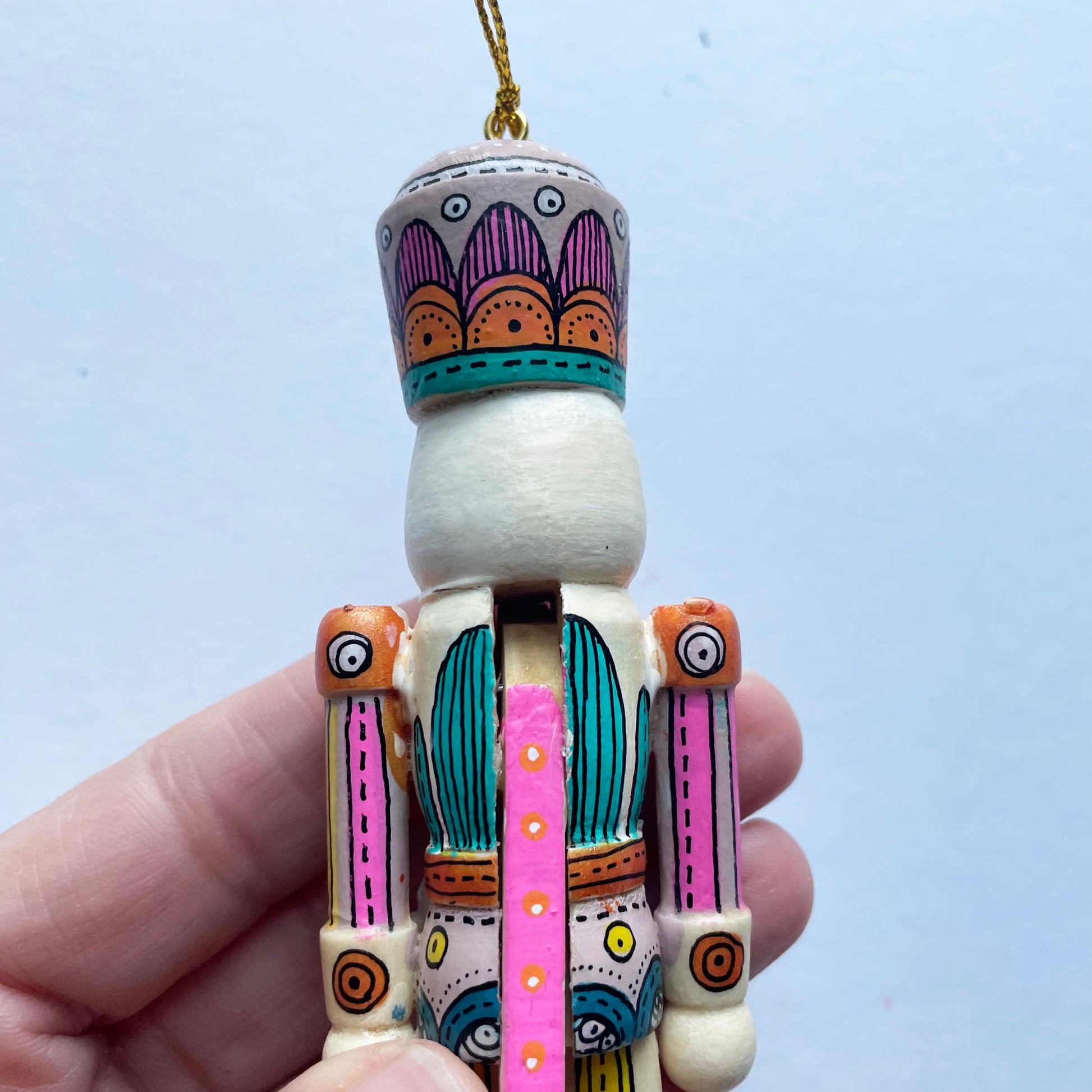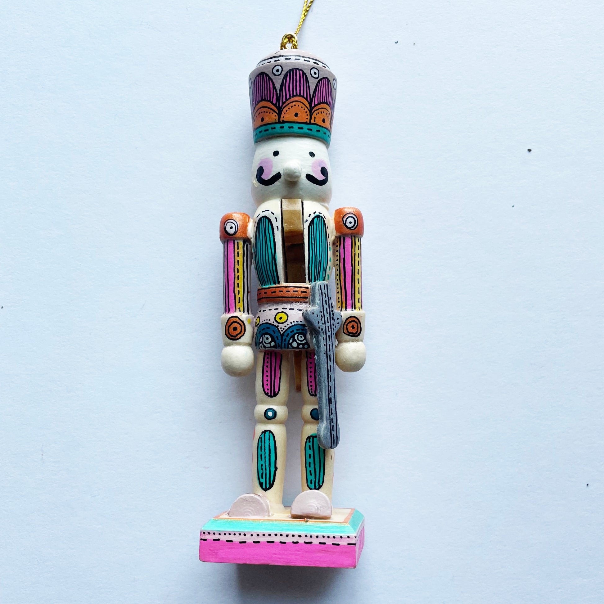 This nutcracker ornament is an original, hand-painted piece of art. Each wooden nutcracker is carefully painted by hand using acrylic paint, acrylic markers, and pen and ink.
