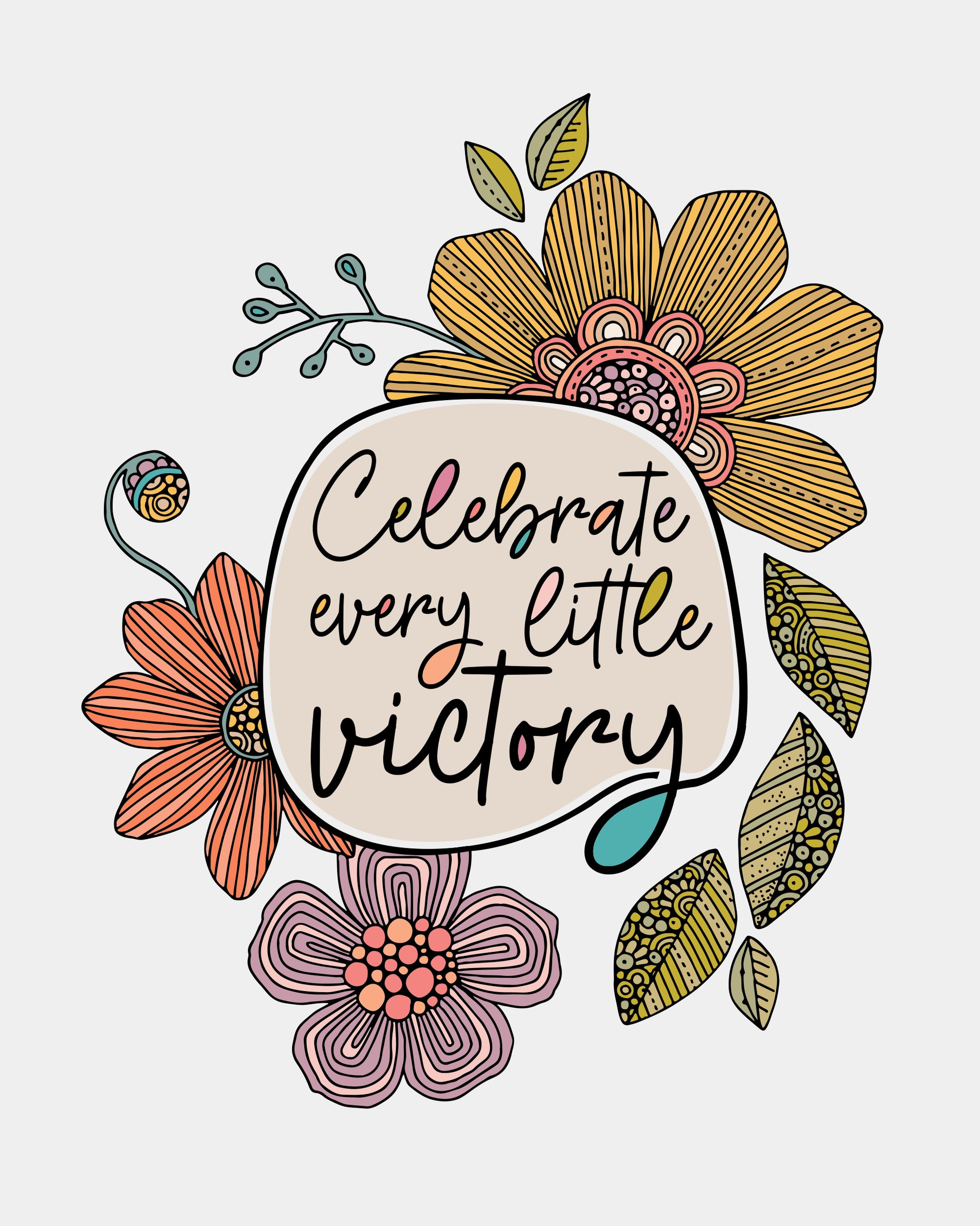 This beautiful "Celebrate Every Little Victory" art print is a perfect daily reminder to acknowledge and appreciate all your accomplishments, big or small. Adorned with cheerful, intricately designed flowers and leaves, its vibrant colors and heartwarming message create a positive and encouraging atmosphere in any room.