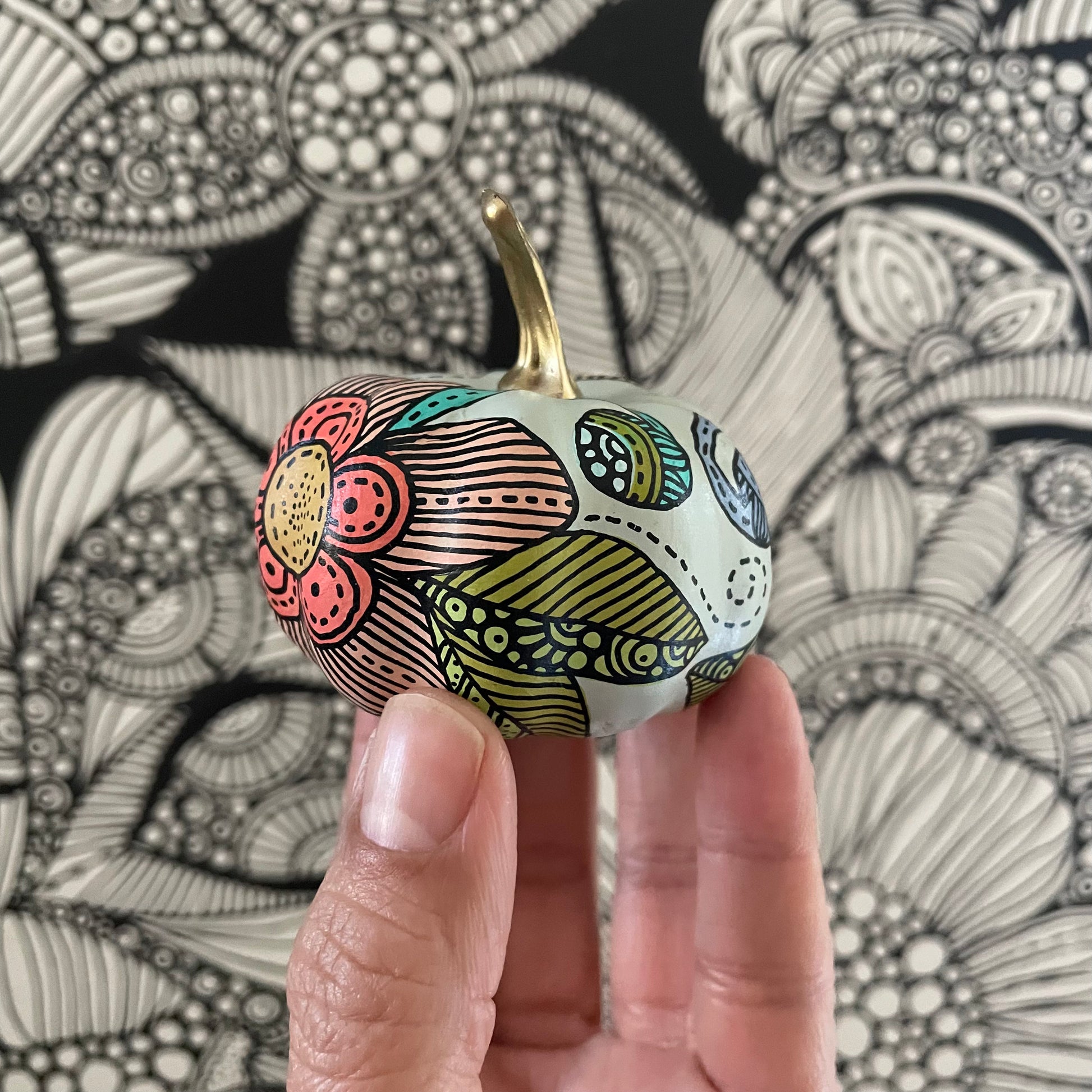 This listing is for ONE artificial pumpkin mad of made of foam and plastic, and all painted by hand using acrylic paints and a rapidograh with ink for the intricate little details. Each Pumpkin is one off a kind - original art