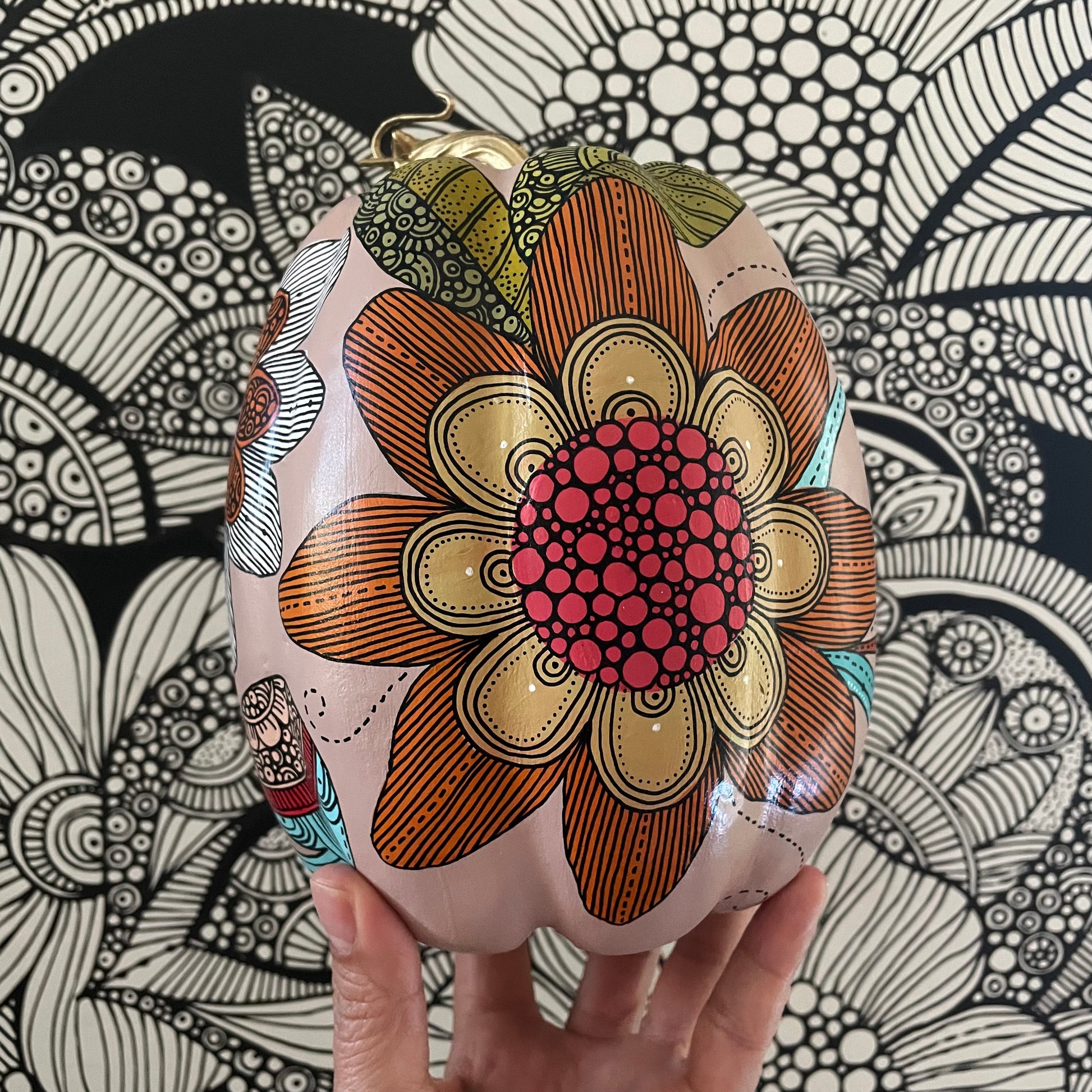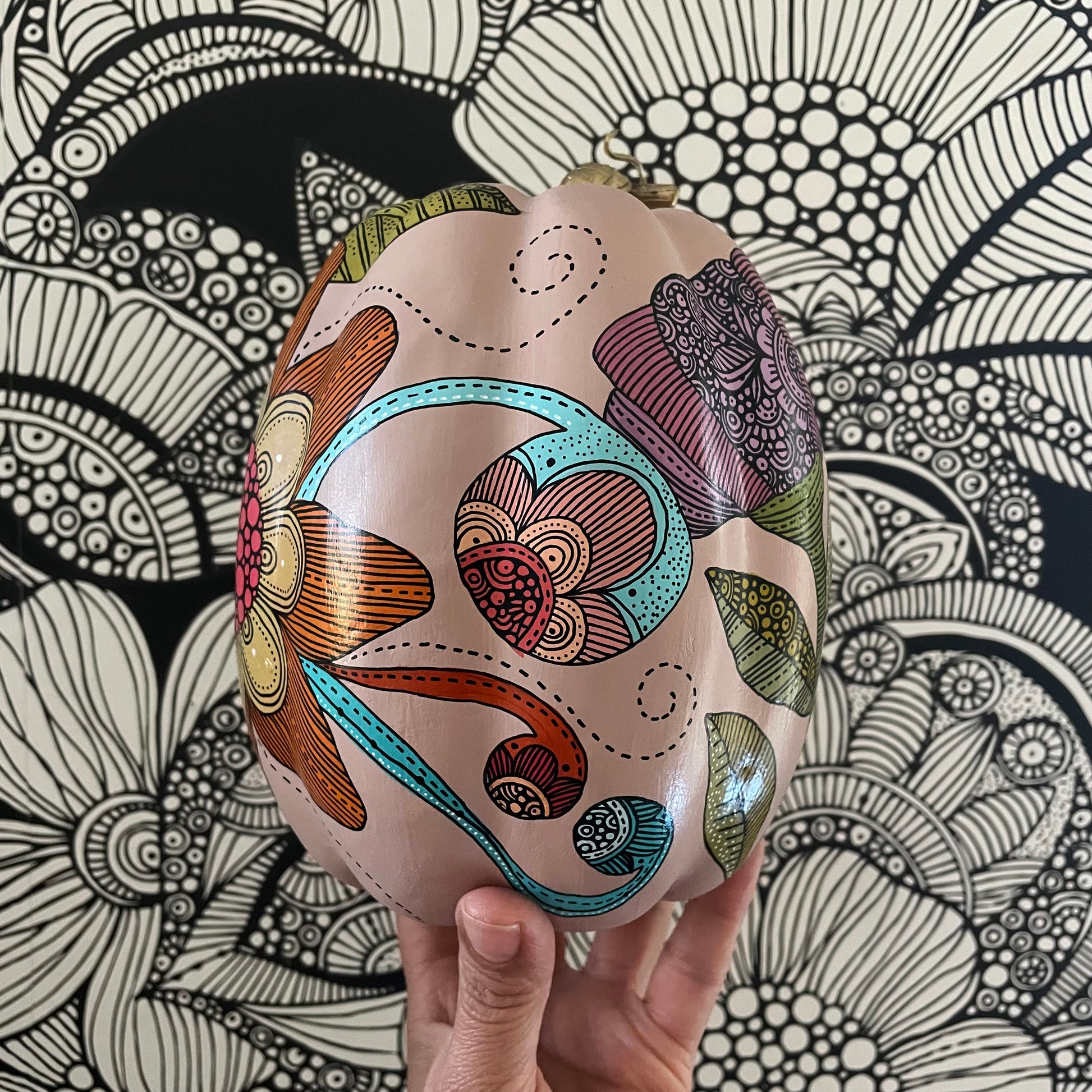 This listing is for ONE artificial pumpkin mad of made of foam and plastic, and all painted by hand using acrylic paints and a rapidograh with ink for the intricate little details. Each Pumpkin is one off a kind - original art