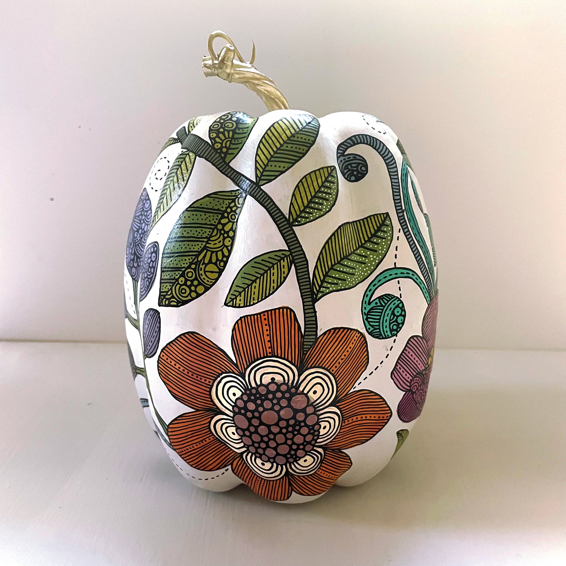 This listing is for ONE artificial pumpkin mad of made of foam and plastic, and all painted by hand using acrylic paints and a rapidograh with ink for the intricate little details. Each Pumpkin is one off a kind - original art