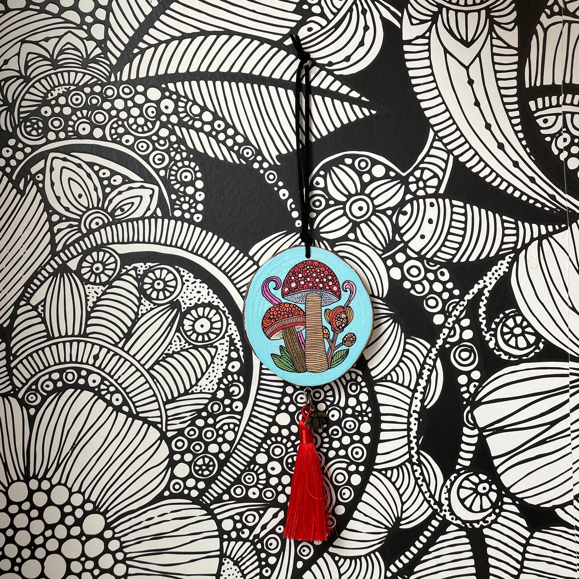 Original, one-of-a-kind hand-painted wood slices, each wall hanging features a cute tassel and a small charm for an extra special touch. I painted every slice using acrylics and added all the fine details with pen & ink, using a rapidograph and a tiny brush.