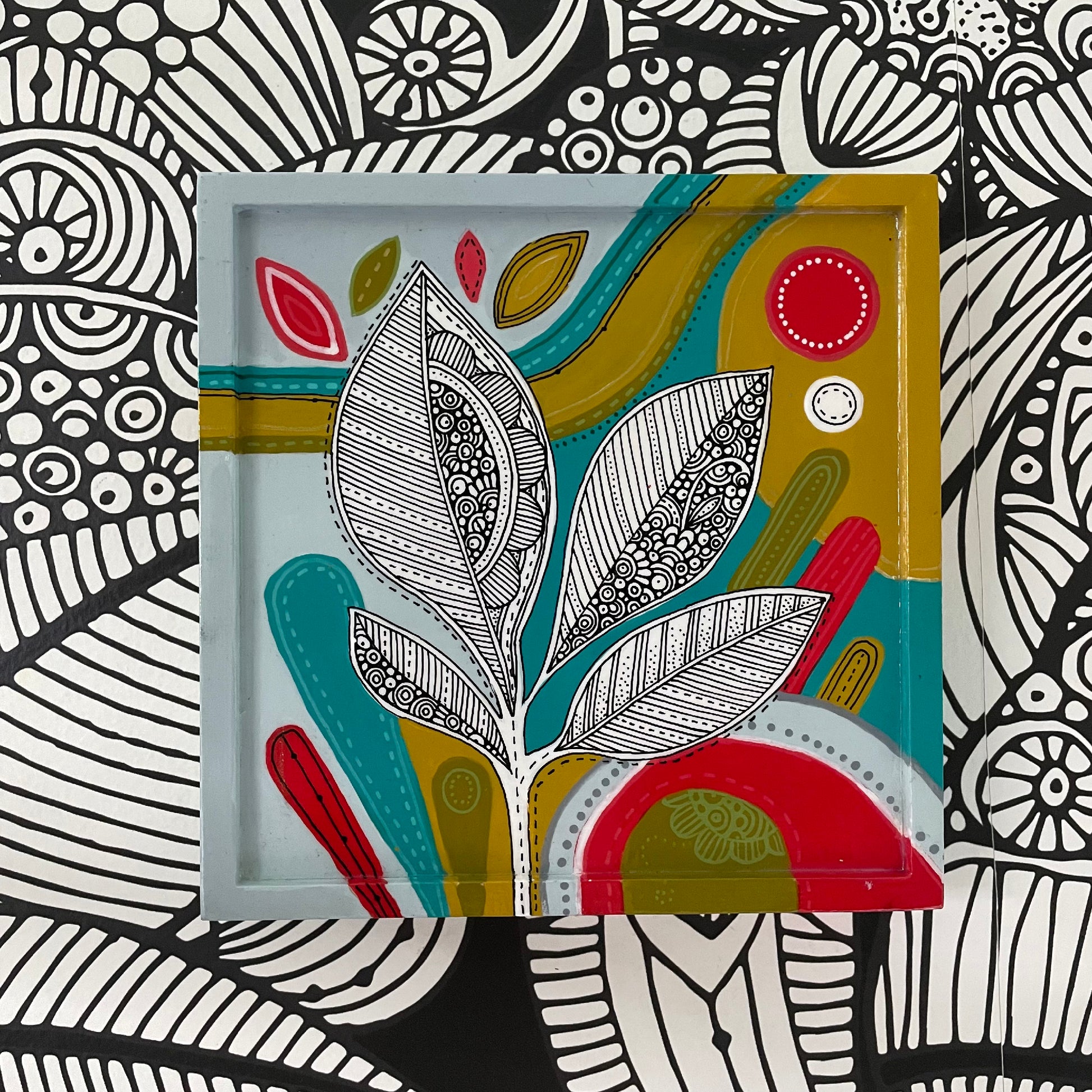 This original artwork is made on 6x6 inches gesso panel feature a 1/8" raised lip. 6x6 inches, 3/4" deep. The borders are painted I used acrylic paints, acrylic markers and rapidograph with ink for all the little details. This is an original hand painted item. Each of my artwork is complete original and unique with their own little imperfections too!