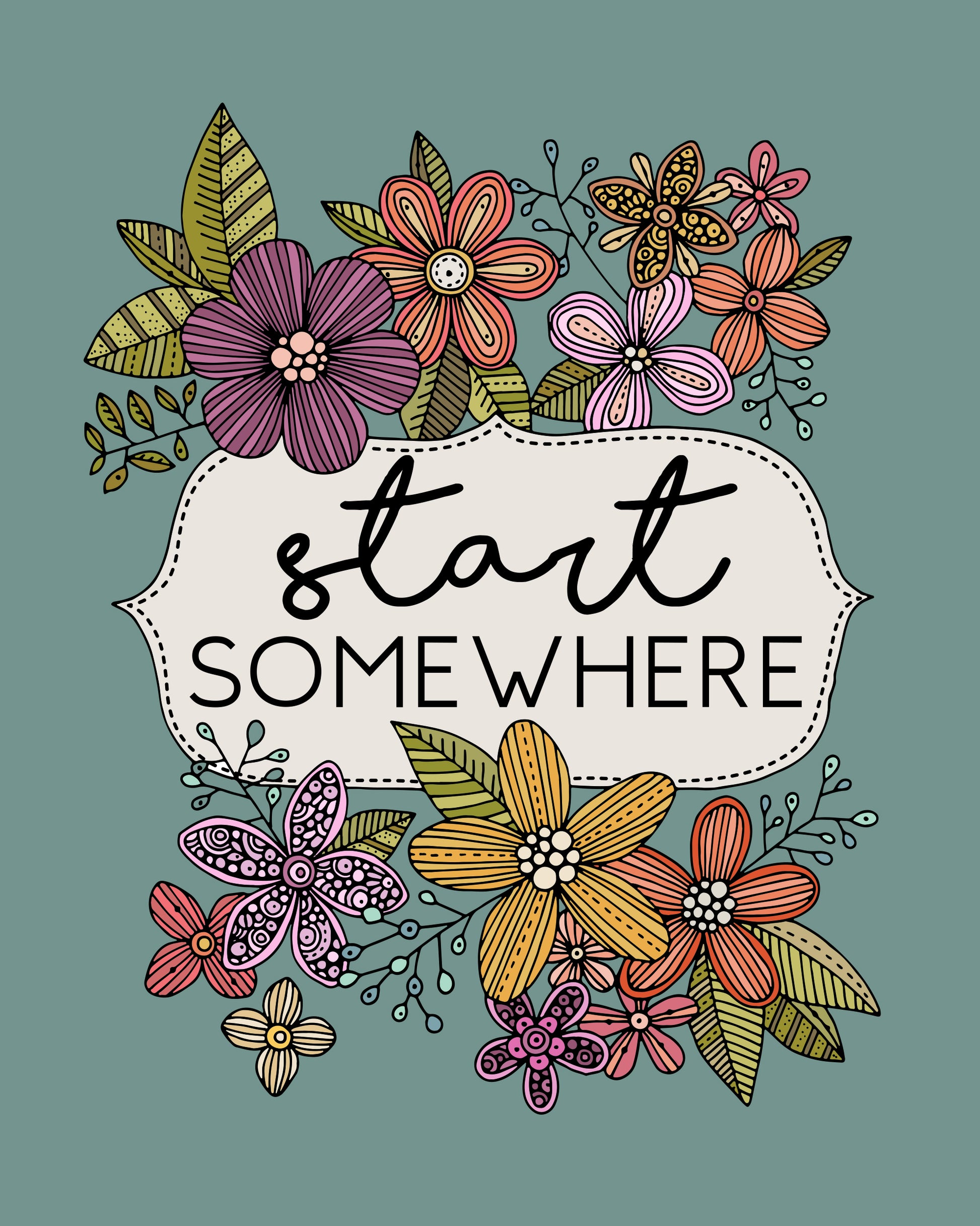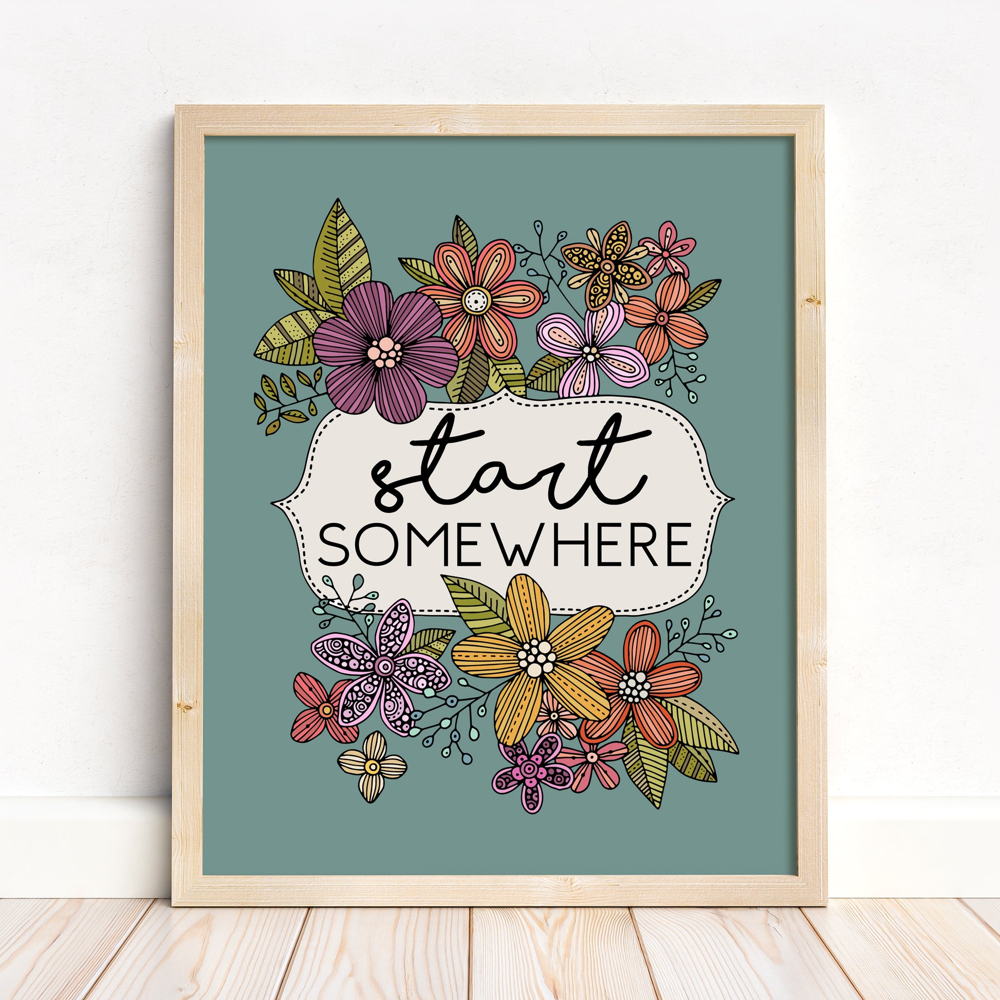 Take the first step with confidence with our "Start Somewhere" art print. This motivating message is set within a charming framed design, adorned with a medley of colorful, hand-drawn flowers and lush foliage. It's an encouraging reminder that every great journey begins with a single step, inspiring action and removing the pressure of perfection.